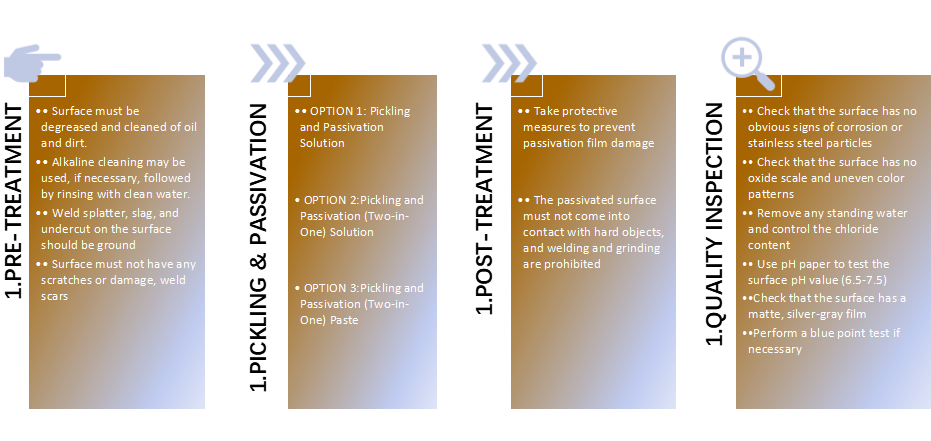 Austenitic stainless steel is typically passivated using a solution primarily composed of strong oxidizing nitric acid. To ensure the effectiveness of the passivation treatment, the surface to be passivated is first subjected to a pickling process. The entire sequence of these treatments is collectively referred to as pickling and passivation.