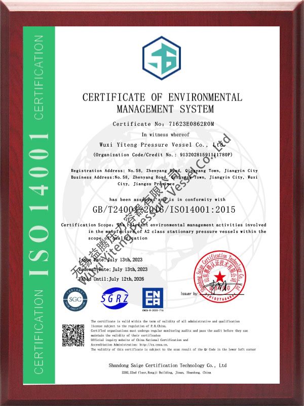 A2设计制造资质、 ASME U钢印规范产品制造资质、 ISO9001质量体系认证、 ISO45001/ISO14001职业健康安全管理认证、 2023年江苏省高新技术企业、 完全胜任制作ASME/PED/TR-CU/DOSH规范的产品