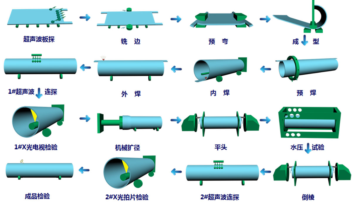 将钢板边缘预先弯曲,以利于后续卷管成型。 |